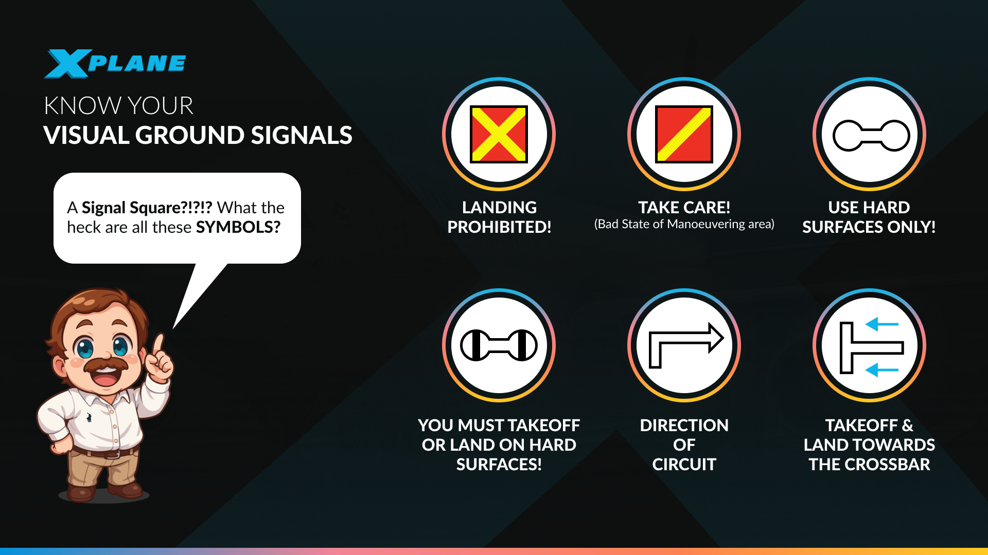 Airport ground assets now include signal squares, accurately placed in their real-world locations near the movement area. These ground markings are used at certain aerodromes to display visual signals and instructions to pilots, particularly for VFR operations and non-radio communications.