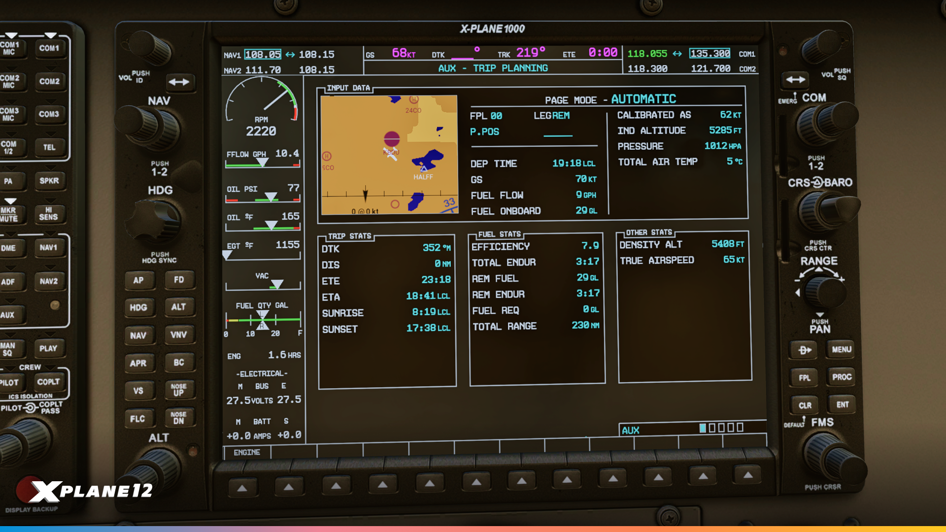 Major new features include enhanced Trip Planning capabilities with a dedicated page showing ETA/ETE to your destination. For day VFR operations, the sunset and sunrise times at arrival are calculated, so you can make sure you are legal for night currency requirements. Fuel efficiency calculations with estimated fuel remaining, plus density altitude and total air temperature are also available. The new Utility page tracks your flying statistics including time in air, time since power-up, distance flown (odometer), and ground speed records – perfect for those who love tracking their flying data. Your parameters are remembered per-aircraft, so you can track your ground speed records in the 172 and the Cirrus separately.