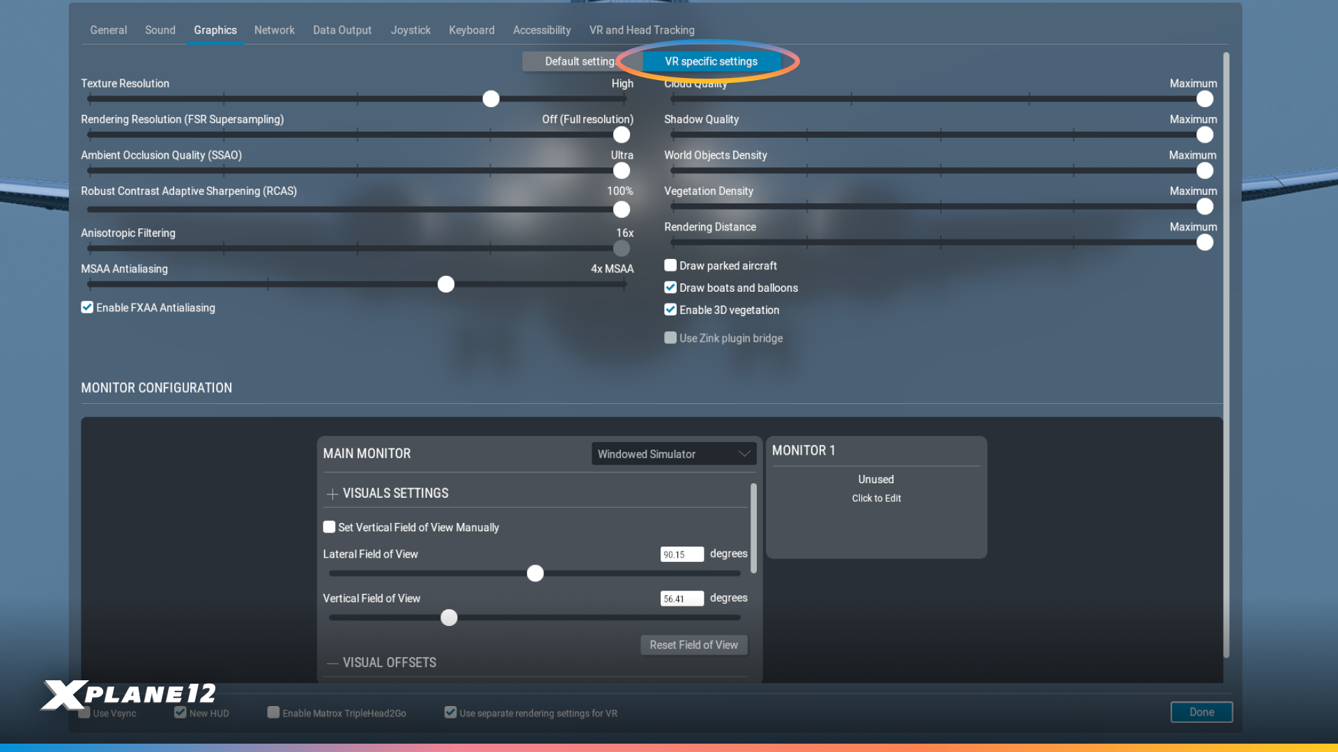 A major addition is the new VR-specific graphics settings option. You can now choose between “Default settings” and “VR specific settings,” allowing you to optimize graphics independently for VR use. This means you can maintain higher quality settings for desktop flying while using performance-optimized settings for VR, or vice versa, without constantly adjusting individual options.