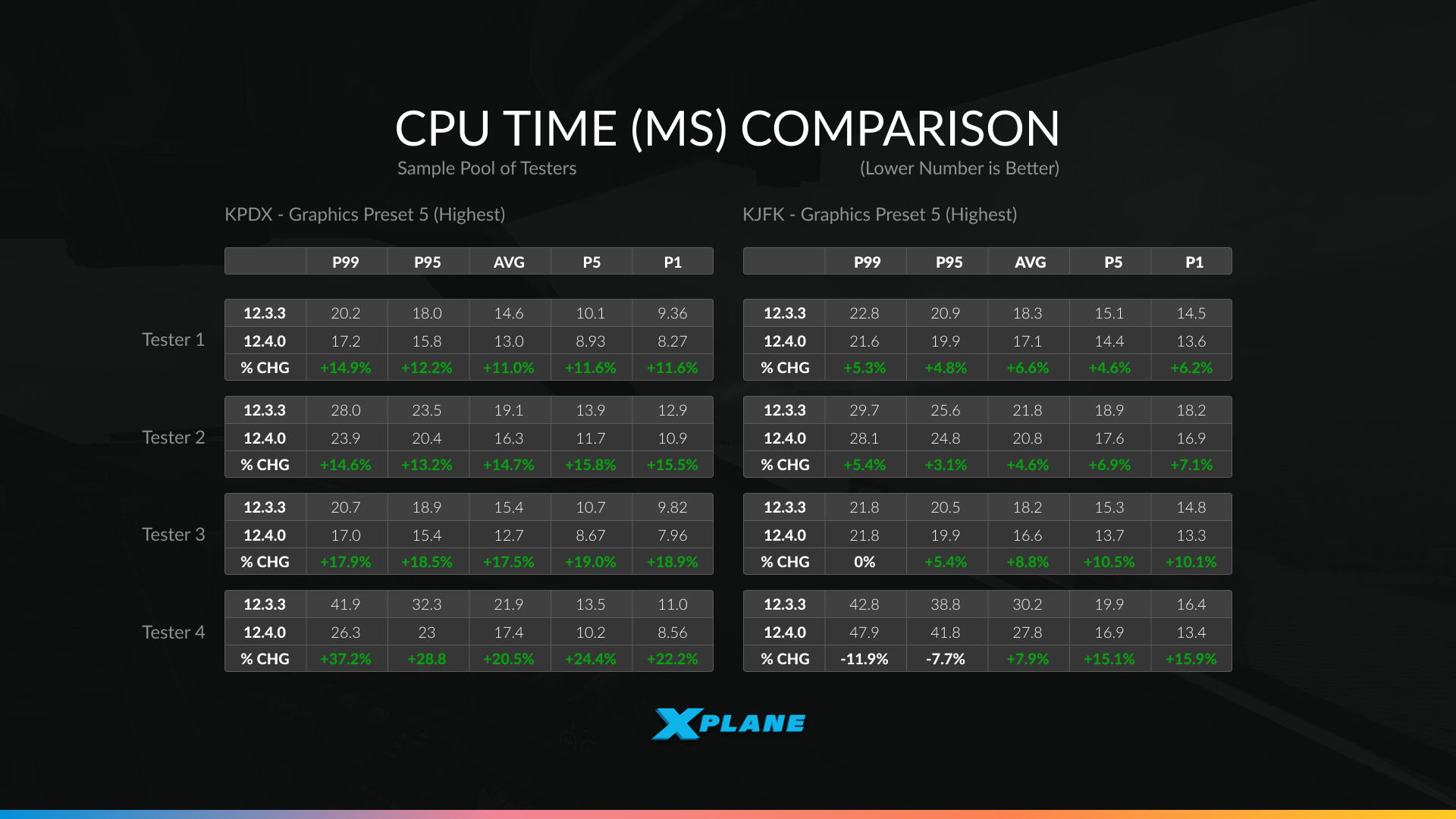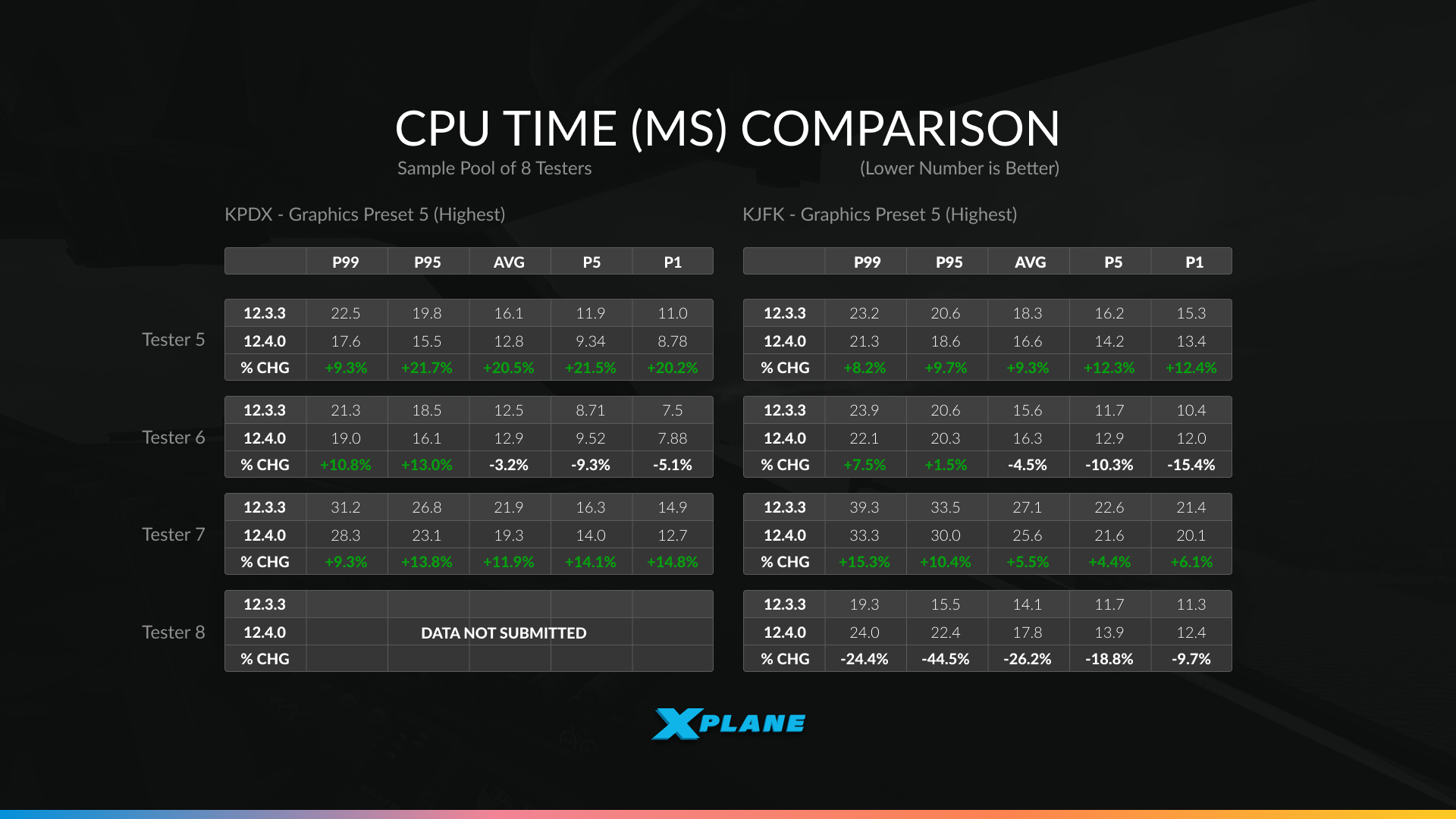 - Significant improvements: Tester 2 saw gains up to 15.8% at KPDX and 13.1% at KJFK. Tester 7 achieved improvements ranging from 7.9% to 14.8%. These systems were clearly CPU-limited and had cores available for the new multi-threaded scenery processing.
