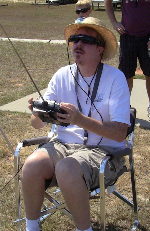 Below, I am flying an airplane with a tiny video camera mounted on it's nose, and a transmitter that sends the camera image to the ground, and into the virtual-reality goggles I am wearing! So, flying this RC model was like flying a real airplane! In the low fly-bys, I could see myself sitting there flying the airplane! A REAL out-of-body experience! HAR!